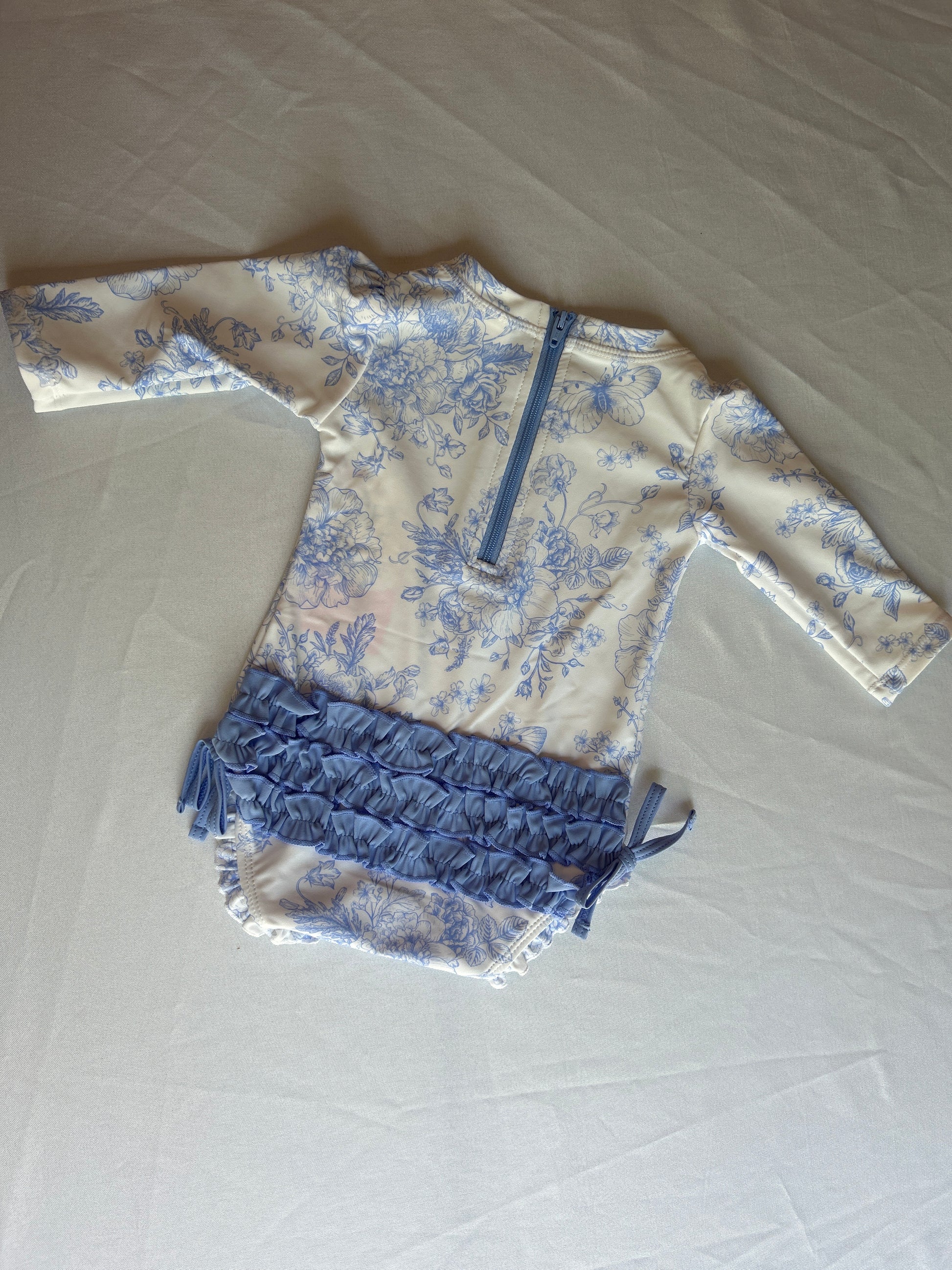 This one-piece rashguard features a delicate blue floral print on a cream background, with a back zipper for easy changing and ruffled detailing on the bottom for a charming touch.