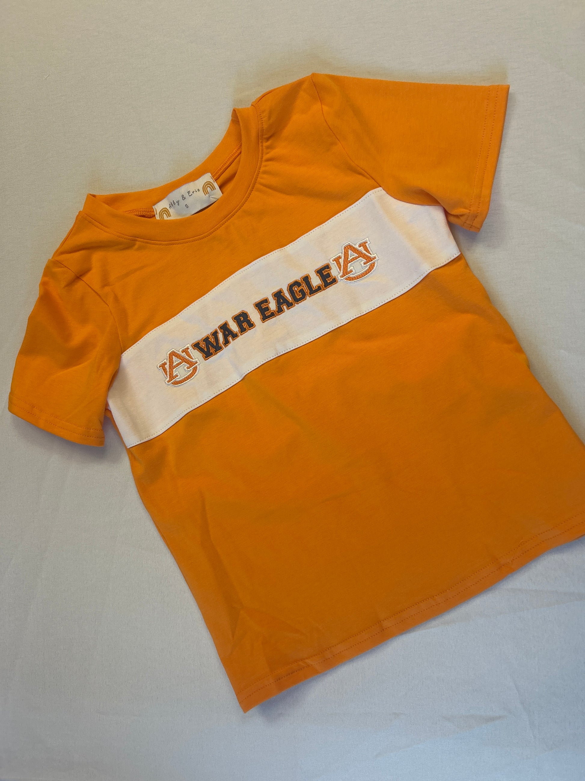 Show your team spirit with this vibrant orange tee, featuring a crisp, contrasting band across the chest emblazoned with "WAR EAGLE." Perfect for game day or any day, this soft and stylish shirt lets you cheer on your team in comfort and style. Go, team!